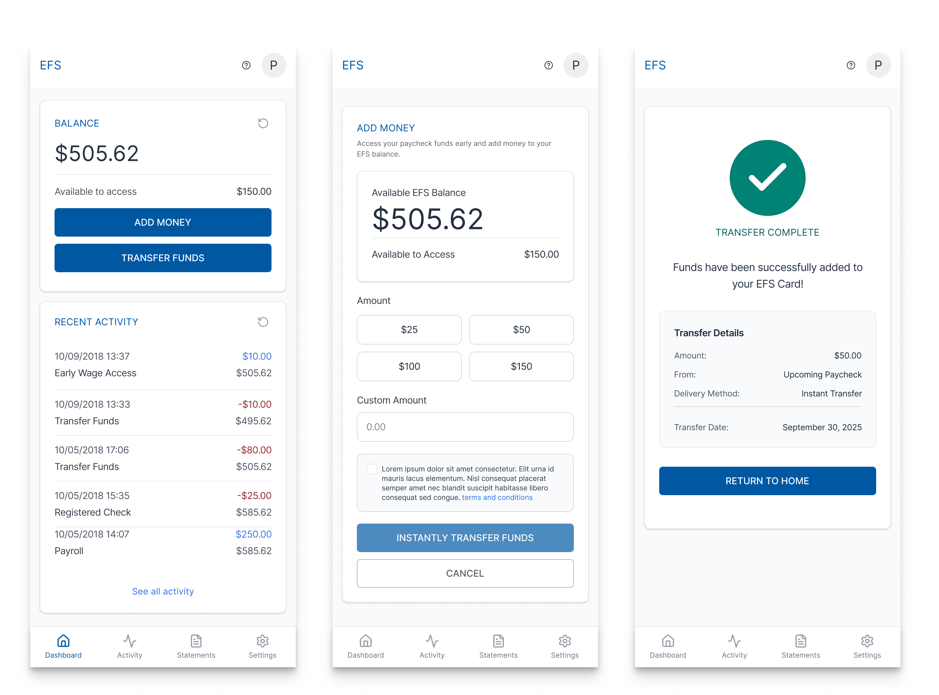Designed flows and screens showing how Earned Wage Access would integrate into PayControl